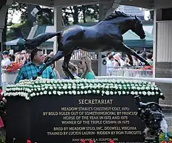Secretariat's finishing time in his 1973 Belmont victory (2 minutes, 24 seconds) set a world record for 1+12 miles (2.4 km) on dirt,[35] a world record which still stands. The 31-length victory clinched the first Triple Crown in 25 years, dating back to Citation in 1948. A statue of Secretariat is in the center of the Belmont paddock.