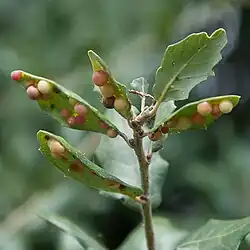 The asexual generation galls are smooth, unilocular balls that appear on the ventral side of leaves. Young galls are orange or light brown and darken as they age. The sexual generation galls are irregular shaped, multilocular clusters of galls appearing on small rootlets.[1][4]