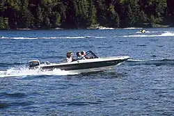 Water skiing is permitted only in the south end of the lake in the marked water skiing area. Boats are required to travel in a counterclockwise direction. Boats not towing water skiers or tubers are not permitted to enter the waters of the skiing area.[4]