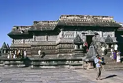 - The original temple was without boundary wall. The main mandapa was also open for the devotees to view and appreciate the intricate carvings inside the temple. For security of the temple, a high wall was constructed around the temple, a wood-and-brick gateway and doors added by Somayya Danayaka during the rule of Veera Ballala III (1292–1343), as well as the open mandapa was covered with perforated stone screens. The new screens darkened the inside of the temple making it difficult to see the artwork but allowed enough light for the darshana of the garbha griya.[19][20]