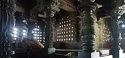 The Chennakesava temple has three entrances and their doorways have decorated sculptures called dvarapalaka (doorkeepers) on either side.[48] The central hall (navaranga) was originally open on all sides except the west where the sanctum is, but all sides were later closed with perforated screens.[49] This reduced the amount of light significantly and the intricate art work is difficult to appreciate without secondary light. The artwork starts on entry to the three entrances to the hall. Each leads to raised verandas on both sides. The hall has carved pillars with a large domed ceiling in the center.[48] The mandapa has 60 "bays" (compartments).[50]