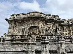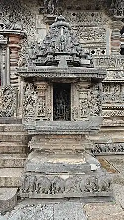The temple is a ekakuta vimana design (single shrine) of 10.5 m by 10.5 m size. It combines elements of North Indian Nagara and South Indian Karnata style architecture.[5] The temple stands on an open and wide platform designed to be a circumambulatory path around the sanctum. The temple and platform were without walls and the platform surrounded an open mantapa, following the contour of the temple. A visitor would have been able to see the ornate pillars of the open mantapa from the platform.[31] Later walls and stone screens were added, creating an enclosed vestibule and mantapa, providing security but creating too much dark to appreciate the artwork inside. The vestibule connects the circumambulatory platform to the mandapa (hall). There is intricate and abundant artwork both on the outside and inside the temple.[32]