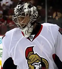 On February 26, 2012, Bishop was traded to the Ottawa Senators in exchange for a second-round pick in the 2013 NHL entry draft.[17] A kitchen accident resulted in Senators' starting goaltender Craig Anderson being injured indefinitely with a hand laceration, a situation that may have hastened Bishop's move to Ottawa.[18] At the time of the trade, Bishop was the AHL's top goaltender with a 24–14–0 record, a 2.26 GAA, a .928 save percentage and an AHL-leading six shutouts through 38 games.[19] Bishop made his Senators debut against the Tampa Bay Lightning on March 6, 2012, in a game which Ottawa won 7–3. He earned his second win in as many starts in a 4–1 win over the New York Rangers. He finished the season with a 3–3–2 record and 2.48 GAA in ten games played with Ottawa.[14]
