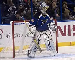 Benjamin Manning Bishop III[1] (born November 21, 1986) is an American former professional ice hockey goaltender. Bishop previously played for the St. Louis Blues, Ottawa Senators, Tampa Bay Lightning, Los Angeles Kings, and Dallas Stars of the NHL. Nicknamed "Big Ben", Bishop is the tallest goaltender ever to play in the NHL, along with Mikko Koskinen, Mads Søgaard, Ivan Fedotov, and Dennis Hildeby at a height of 6 ft 7 in (2.01 m).[2][3] He was a three-time Vezina Trophy finalist as the NHL's top goaltender.