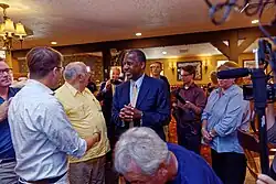 On September 30, it was reported that Carson's campaign had raised US$20.2 million in the third quarter of 2015, thus bringing the campaign's grand total to US$31 million. The additional US$20.2 million was raised through just over 600,000 donations from 353,000 individuals, and altogether was more money raised than the entirety of the 2012 GOP field up to that same point in 2011, and was the highest amount raised by any candidate in the 2016 field; the next-highest was Bush, who raised US$13.4 million.[85] Carson also had the second-highest amount of money on hand at the end of the third quarter, with US$12 million, only behind Ted Cruz's US$13.5 million.[86] In the same period, The 2016 Committee reported that it had raised US$2.8 million and had reached a new total of 31,000 volunteers.[87]