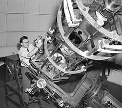 In 1957, administrative responsibility for the Commonwealth Observatory was transferred from the Australian Government's Department of the Interior to the Australian National University (ANU), a move supported by both its director, Richard Woolley, and Gascoigne.[15] This was an era of significant change at Mount Stromlo: in January 1956 Woolley had resigned as director of Mount Stromlo to take up a position as Astronomer Royal and director of the Royal Observatory Greenwich.[16] He was replaced by Dutch-American Bart Bok, whom Gascoigne liked and under whose directorship he played a significant role.[17] Also in 1957, the Mount Stromlo team began searching for a new field observatory site, due to the increased light pollution from Canberra's growth.[18] The search was vigorously promoted by Bok, and after an examination of 20 possible locations, two were shortlisted: Mount Bingar, near Griffith, New South Wales, and Siding Spring, near Coonabarabran, New South Wales.[19] Gascoigne was one of a group of scientists who visited Siding Spring Mountain as part of the search,[20] and he was one of those who advocated this choice:[21]