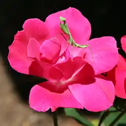 A European mantis (Mantis religiosa) hunts for prey, using a rose flower as a vantage point.