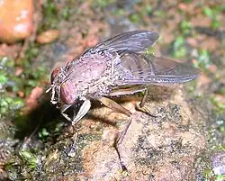 Bengalia is a genus of blow flies in the family Calliphoridae with one authority considering the genus to belong to a separate family Bengaliidae.[3] These bristly and, unlike the greens and blues of most calliphorids, dull coloured flies, are especially noted for their relationship to ants. Little is known of their biology and life-cycle, although adults of many species are kleptoparasitic on ants and will snatch food and pupae being carried by ants or feed on winged termites.[4][5][6] The apt name “Highwayman Fly” was given by an early observer of their way of robbing ants.[6] Very little is known about their breeding habits. The genus is found in the Afrotropical and oriental region with one species from Australia possibly a recent introduction.