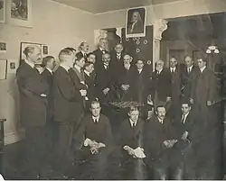 In 1727, at age 21, Franklin formed the Junto, a group of "like minded aspiring artisans and tradesmen who hoped to improve themselves while they improved their community." The Junto was a discussion group for issues of the day; it subsequently gave rise to many organizations in Philadelphia.[24] The Junto was modeled after English coffeehouses that Franklin knew well and which had become the center of the spread of Enlightenment ideas in Britain.[25][26]
