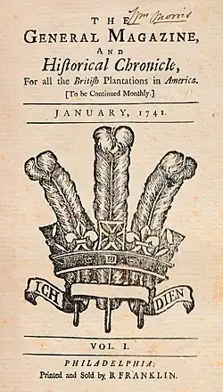 In 1732, Franklin began to publish the noted Poor Richard's Almanack (with content both original and borrowed) under the pseudonym Richard Saunders, on which much of his popular reputation is based. He frequently wrote under pseudonyms. The first issue published was for the upcoming year, 1733.[65] He had developed a distinct, signature style that was plain, pragmatic and had a sly, soft but self-deprecating tone with declarative sentences.[66] Although it was no secret that he was the author, his Richard Saunders character repeatedly denied it. "Poor Richard's Proverbs", adages from this almanac, such as "A penny saved is twopence dear" (often misquoted as "A penny saved is a penny earned") and "Fish and visitors stink in three days", remain common quotations in the modern world. Wisdom in folk society meant the ability to provide an apt adage for any occasion, and his readers became well prepared. He sold about ten thousand copies per year—it became an institution.[67] In 1741, Franklin began publishing The General Magazine and Historical Chronicle for all the British Plantations in America. He used the heraldic badge of the Prince of Wales as the cover illustration.
