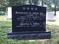 Davis's wife Agatha died on March 10, 2002. (Aged 94)[31] Davis, who had been suffering from Alzheimer's disease, died at age 89 on July 4, 2002, at Walter Reed Army Medical Center in Washington, D.C. He was interred with Agatha on July 17, at Arlington National Cemetery.[32] A Red Tail P-51 Mustang, similar to the one he had flown in World War II, flew overhead during his funeral service. Bill Clinton said, "General Davis is here today as proof that a person can overcome adversity and discrimination, achieve great things, turn skeptics into believers; and through example and perseverance, one person can bring truly amazing change".[33]