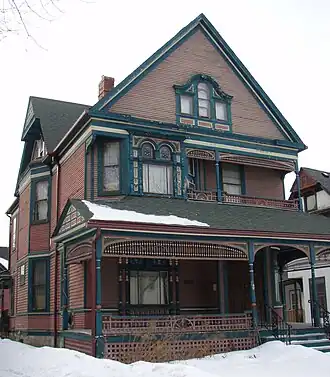 Theron P. Healy moved to the city of Minneapolis in 1884 and decided to capitalize on the need for housing in the fast-growing city. Queen Anne style architecture in the United States was rapidly becoming popular after the Centennial Exposition in Philadelphia in 1876.[2] The Bennett-McBride house was built in 1891 for local lumberman H.H. Bennett. While the exterior is similar to most of the Queen Anne houses on the block, the interior has some distinguishing features, particularly in its woodwork. The dining room features quarter-sawn oak, and the lacy fretwork has been well preserved, both on the inside and outside.[3]