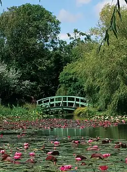 Bennetts Water Gardens is an 8-acre (32,000 m2) garden in Chickerell, near Weymouth, Dorset, in southern England. It holds national and international collections of water lilies which flower from late May through to September. The plants are displayed in a series of ponds and lakes. A feature of the garden is a blue Japanese bridge built in 1999 to celebrate 100 years since Claude Monet painted his famous piece Water Lily Pond 1899.