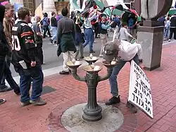 Two reasons have been suggested for his decision to donate the fountains. One was his hope that they would reduce the consumption of alcoholic beverages during lunch breaks, and the other was that he felt the need after witnessing a girl crying at an Independence Day parade due to her inability to find a drink of water.[1] In the 1970s, the Benson family requested that the bubblers only be installed within specific boundaries of Downtown Portland "so as not to diminish the uniqueness of them".[1]