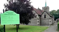 The Benson Memorial Church , dedicated to St Richard of Chichester , is an English Roman Catholic church in the Hertfordshire town of Buntingford . Its name derives from the notable priest and author Robert Hugh Benson who lived locally at Hare Street House and helped fund construction of the church. Benson laid the foundation stone[ 1] but died before the building was completed. The parish currently shares a parish priest with the Catholic churches in Puckeridge and Old Hall Green .