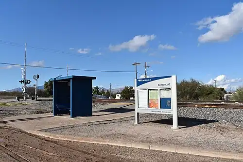 Benson station is a train station in Benson, Arizona. It is served by Amtrak's Sunset Limited and Texas Eagle, which pass through Benson 3 days a week in each direction.[2] There are no facilities for Amtrak passengers other than a small metal shelter. The nearby Southern Pacific Railroad Depot replica building has been used as a tourist information center.[3] The building is also the location of bus stops for Benson Area Transit and Greyhound.