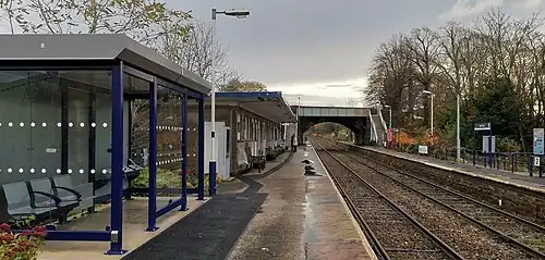 Timetable posters and digital information screens on both platforms provide train running information, whilst there are waiting shelters on each side. The stone shelter on the westbound platform was constructed by the Midland Railway, whereas its counterpart on the opposite platform is much more modern in comparison.[7][8]