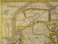 The caravan then crossed the "desert of Caracathai", or "the Black Land of the Cathayans", which Góis learned was named after the "Cathayans [who] had lived there for a long time".[30] The next major stop was the small but strongly-fortified city of Cialis, where the travelers spent three months, as the caravan's chief waited for more merchants to join.[31] Although it follows from the geography of the route (between Kucha and Turpan) that Cialis had to be located somewhere within today's Bayin'gholin Mongol Autonomous Prefecture, its identity has been a subject of speculation among later historians.[32] Some thought that it was the city known to us as Korla (today, the capital of the prefecture),[33] But others opined for Karashar, some 50 km farther to the northeast.[34]