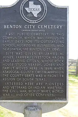 Benton City Institute was an important early educational institution in the area, and its ruins are the only remaining building in town. It was built in 1875,[6] established in 1876,[7] and originally called the Benton City Normal Institute, operating under a Texas law distributing state funds to supplement private tuition, but owned and operated by educators. It was first run by John D. Morrison. In 1876, the top floor was bought and used by Atascosa Lodge 379, A.F. & A.M., and classes were held in the lower floor.[8][9][10] Curricula included basic foundation courses plus accounting, law, music, and surveying. Later, the school became fully tax-supported.[11]
