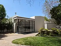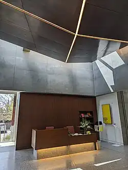 The museum is located near the southwestern edge of Pomona's campus, adjacent to the Village, Claremont's downtown commercial district.[26] It was designed collaboratively by Boston-based Machado and Silvetti Associates and California-based Gensler, and cost $44 million to build.[26] The building is U-shaped around a courtyard,[26] and is constructed primarily of cast-in-place concrete, with stained heavy timbers as an ornamental accent.[31] It features several visual axes, and is designed to be "visually porous" so that visitors can easily see both into and out of it.[31] It was designed to a LEED Gold standard.[32]