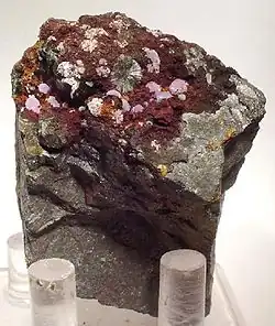 ![]() Crystalline beraunite on green kidwellite, Coon Creek Mine, Polk County, Arkansas, US. Size: 3.4 × 3.3 × 2.8 cm | |