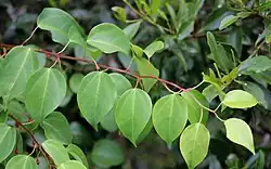 The leaves are simple, ovate to broad–ovate, alternate, palmately veined.[2][9] They are usually 3 cm to 6 cm long.[2] Leaves are soft and thin, with a hairy look-like structure in the midvein and lowest veins.[2]