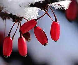 B. thunbergii has deeply grooved, brown, spiny branches with a single (occasionally tridentine) spine (actually a highly modified leaf) at each shoot node. The leaves are green to blue-green (reddish or purple in some horticultural variants), very small, spatula to oval shaped, 12–24 mm (1⁄2–15⁄16 in) long and 3–15 mm (1⁄8–9⁄16 in) broad; they are produced in clusters of 2–6 on a dwarf shoot in the axil of each spine. The flowers are pale yellow, 5–8 mm (3⁄16–5⁄16 in) diameter, produced in drooping 1–1.5 cm (3⁄8–5⁄8 in) long umbrella-shaped clusters of 2–5; flowering is from mid spring to early summer. The edible fruit is a glossy bright red to orange-red, ovoid berry 7–10 mm (9⁄32–13⁄32 in) long and 4–7 mm (5⁄32–9⁄32 in) broad, containing a single seed. They mature during late summer and fall and persist through the winter.[4]
