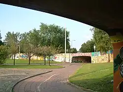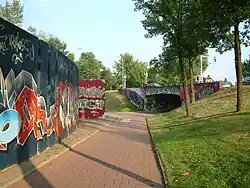 The Berenkuil is also well known in Eindhoven for another reason: it has been designated a freezone for graffiti artists, where they can paint graffiti without interference from the police. As a result, artists have created several large and impressive works on the walls and the area has become an unofficial open-air museum.[1][2] On 11 and 12 September 2010, the Berenkuil was the stage for the international graffiti festival "Step In The Arena",[3][4] which was held again on 9 and 10 July 2011.