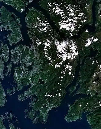 The Bergen Peninsula (Bokmål: Bergenshalvøya, Urban East Norwegian: [ˈbæ̀rɡn̩sˌhɑɫːœʏɑ]; Nynorsk: Bergenshalvøya) is a peninsula in Vestland county, Norway. The city of Bergen, Norway's second largest city, is located on the peninsula. The peninsula extends out from the mainland and it is surrounded by the following fjords: Samnangerfjorden, Bjørnafjorden, Fusafjorden, Raunefjorden, Byfjorden, Salhusfjorden, Sørfjorden. The peninsula is connected to the rest of mainland Norway by a narrow, 6.5-kilometre (4.0 mi) wide strip of land between the villages of Trengereid and Årland. The 465-square-kilometre (180 sq mi) municipality of Bergen, about 140-square-kilometre (54 sq mi) of the municipality of Bjørnafjorden, and about 50 square kilometres (19 sq mi) of the municipality of Samnanger are all located on the peninsula. The highest point is the 987-metre (3,238 ft) tall mountain Gullfjellet.[1][2]