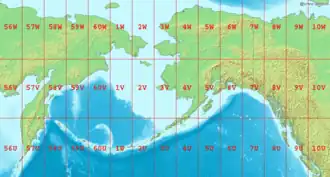 ![]() Map showing the location of the Bering Sea with latitude and longitude zones of the Universal Transverse Mercator coordinate system | |
