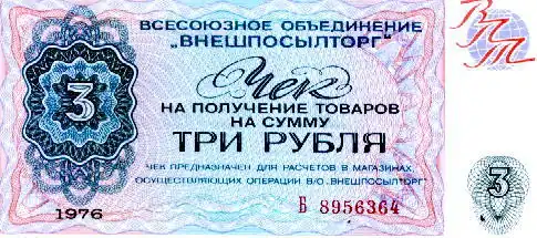 One chain belonged to the Vneshposyltorg (Foreign Mail Order Trade) and was intended for Soviet citizens who were paid some of their salary in foreign currency or received remittances from relatives or friends abroad. The foreign currency had to be exchanged for ruble-denominated Vneshposyltorg cheques, either by the recipient or by government intermediaries.[3]