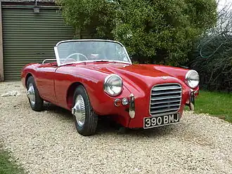 Berkeley's first production car was the 'Sports' (type SA322), announced in September 1956[7] and produced from October 1956 to January 1957. Production began with two prototypes (registered RMJ395 and RMJ946), which were seen being tested around the neighbourhood of Biggleswade in the late summer of 1956. Stirling Moss drove one at Goodwood in September, and the car was launched to the public at the 1956 London Motor Show – one year ahead of the Lotus Elite, which was also to be of fibreglass monocoque construction.