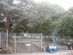 Starting at 8:00 a.m. on September 9, 2008, contractors hired by the university began constructing a 90 feet (27 m) scaffolding around the tree occupied by the tree-sitters.[60][61][62][63] At the same time the UCPD began to move cherry pickers into position around the tree.[61][62][63] The cherry pickers were topped with fabric panels to shield the contractors against anything thrown by the tree-sitters as the scaffolding was constructed.[60] While the scaffolding was under construction, UCPD Chief Victoria Harrison and Assistant Chief Mitch Celaya negotiated with the tree-sitters from a large metal basket suspended from a crane.[60][61][62][63] At noon the scaffolding reached the level of the tree-sitters platform, at which time the tree-sitters platform was dismantled and thrown to the ground to allow the scaffolding to continue.[60] At 12:42 p.m. the scaffolding was completed, with a railing around the highest platform.[60] The UCPD then mounted the scaffolding and began to remove the protesters' supplies.[60] The tree-sitters agreed to come down at 1:01 p.m. after the university agreed to involve the community in addressing future land use issues.[60][63]