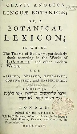 - Clavis anglica linguae botanicae (in Latin) (2 ed.). London: Thomas Becket & Peter Abraham De Hondt. 1764.