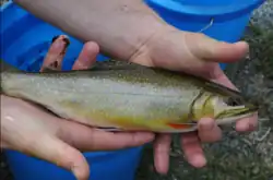 ![]() Employees showcase two adult brook trout (Salvelinus fontinalis) at the Berkshire National Fish Hatchery. | |