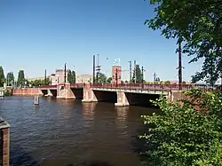The Berlagebrug (Dutch pronunciation: [ˈbɛrlaːɣəˌbrʏx]; English: Berlage Bridge) is a bascule bridge over the river Amstel in Amsterdam, Netherlands. The bridge was commissioned by the Amsterdam municipality[2] and designed by engineer Cornelis Biemond (1899-1980) and architect Hendrikus Petrus Berlage (1856–1934); it was named after the latter. It was constructed from 1926 to 1931 and officially opened on 28 May 1932. It has been designated as a Rijksmonument (National Heritage Site) since 11 May 2008.[1] The bridgekeeper's house carries the address Amsteldijk 134.