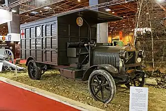 The first CBA vehicles, built in 1913, were fitted with an inline four petrol engine (codenamed L) with a bore of 100 mm and a stroke of 140 mm, giving a displacement of 4,398 cm3. Its power was reported as 22, likely fiscal horsepower (CV). The actual power output was probably higher, but no information is available. The curb weight of these vehicles is 3,250 kilograms (7,170 lb), and the payload of 2.8 to 3 tonnes.[3] The truck has a rear-wheel transmission by chain drive.[4] Brakes are through a pedal acting on the transmission and a lever operating two drums on the rear.[5] In 1913, the French army tested two vehicles, but did not decide to buy larger numbers. Mass production was ordered when World War I broke out in early August 1914 and the French army needed trucks to transport troops and materiel. This variant of the Berliet CBA was built until about mid-1915.[3] There was a forward control version of the CBA produced in 1913 for the military tests, the CBD.[6] By the late 1910s, the CBD was being used primarily as a transit bus and as a 30-seat coach.[5]