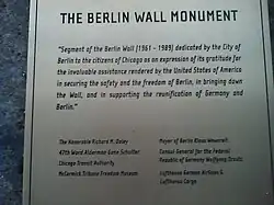 Segment of the Berlin Wall (1961–1989) dedicated by the City of Berlin to the citizens of Chicago as an expression of its gratitude for the invaluable assistance rendered by the United States of America in securing the safety and freedom of Berlin, in bringing down the Wall, and in supporting reunification of Germany and Berlin.