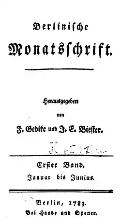 The Berlinische Monatsschrift was a monthly magazine published by Johann Erich Biester and Friedrich Gedike (though the latter resigned his editorship in 1791).
