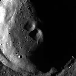 The top image shows a view of Berlioz crater, with the regions that host radar-bright material (yellow) and persistent shadows (red) identified. The middle image was acquired a few hours after the top image, using a longer exposure of the WAC broadband filter, and stretched to reveal the details within the shadowed crater. A distinctively darker region is seen on the crater's floor, which corresponds well with the radar-bright and shadowed regions (bottom image). The darker, low-reflectance material is postulated to be composed of frozen, organic-rich, volatile materials that form through a lag deposit process.[2]