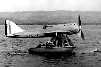 The floats were mounted in a similar fashion to that of a catamaran; they were connected to the central section of the wing by wooden panels and highly resistant steel tubing.[6] Furthermore, each float was connected with the wing via a pair of wires with elastic attachments that prevented abnormal stresses from being transferred through the wires; such forces could occur during a hard landing or in the event of the wing having suffered deformation.[6] Fuel was housed inside of both floats; in operation, the fuel from the left float would automatically transfer across to the right float, from which the fuel was pumped to the engine.[7]