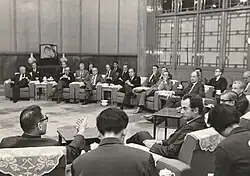 In 1982, with Lee Huebner,[40] the publisher and CEO of the International Herald Tribune, he organized the meeting of 300 businessmen, bankers and diplomats from 35 countries with members of the French Socialist government including Pierre Mauroy, Prime minister, Michel Rocard and Laurent Fabius, Jacques Delors, Jacques Attali, representing President Mitterrand, trade union leaders, members of parliament and two panels of international bankers and industrialists. The conference was covered by 200 journalists from 21 countries, 17 radio stations and a pool of 19 televisions.[41][42][43][44][45][46]