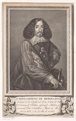 Bernardino de Rebolledo y Villamizar, Earl of Rebolledo and Graf (Count) of the Holy Roman Empire was a Spanish poet, soldier and diplomat (León, baptized May 31, 1597 – Madrid, March 27, 1676). He was a descendant of the 1st Count of Rebolledo, don Rodrigo, who received his surname and title from the king of Asturias and León don Ramiro I in 815 during the Reconquista.