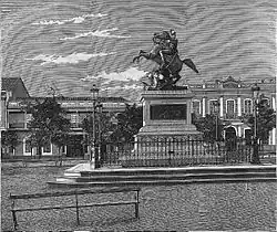 The monument remained at the Altar de la Patria until the final eradication of the architectural complex due to the construction of the Plaza de la Ciudadanía, as part of the works to commemorate the Bicentennial of Chile, which began in 2004. The square was inaugurated in 2006 by President Ricardo Lagos,[5] and transformed the place where the altar was located into a clean esplanade.[6] The equestrian statue took its position in the Plaza de la Ciudadanía, on the south side of the Alameda, in the eastern sector of the square.[7]