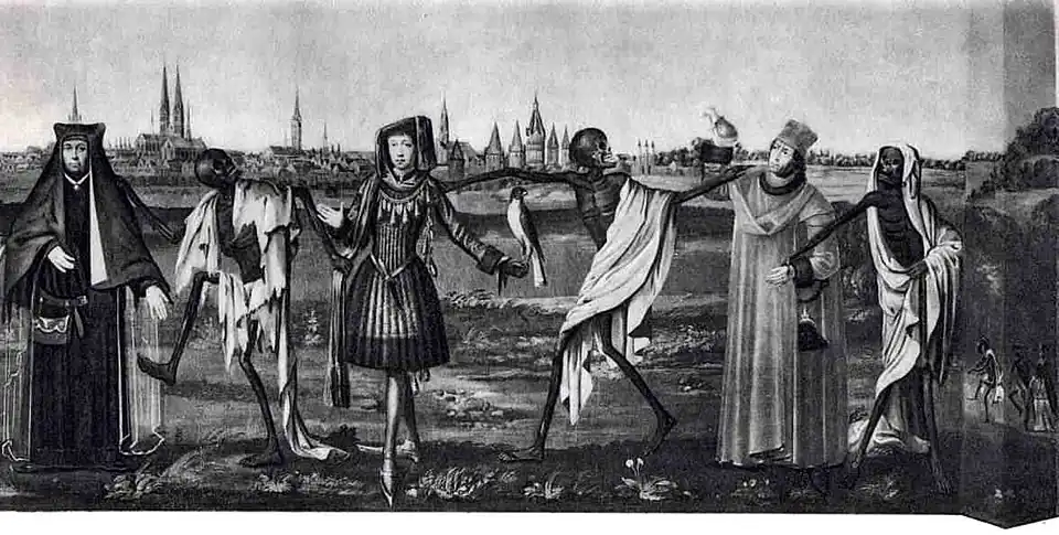 It has been pointed out that already the first work known to have been made by Notke (between 1463 – 1466) is of unusual character: it was a 2 metres (6.6 ft) high and at least 26 metres (85 ft) long tapestry depicting the popular late medieval motif of the Danse Macabre (the dance of Death), made for a chapel of St. Mary's Church in Lübeck. It was lost, most likely destroyed, during the allied bombing of Lübeck in 1942. A copy, made in 1701 by Anton Wortmann, survives.[2][6]