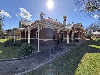 The Edwardian house has wide wooden verandahs, external lacework and a large formal garden and includes stables at rear (now a double garage). The house is a particularly fine example of Edwardian architecture with excellent external detailing. Being located in the main street of the town, opposite Cook Park, it is a key domestic architectural element in the townscape of Orange. Its location, landscape setting and high architectural quality indicate its importance.[1][2] The house is set in a peaceful shadowy garden with large trees. Curtilage to be the lot boundary.[1][2]