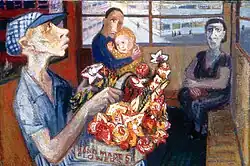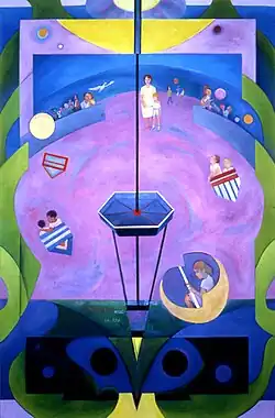 Golahny's early paintings feature a darker palette and rougher line than her later paintings. Much of her early work, such as Street Car Scene, reflects city life in Detroit, New York City, and Chicago: people on buses or trains, workers in factories, and children at play. She blended the abstract and the figurative, often in a given work. Portraiture, including self-portraiture, was a lifelong interest, even as she explored the role of the individual in history and in the cosmos. One series of works, begun around 1964 with a multi-block color woodcut, was titled Landscape of Man in Nuclear Age.[16] The series continued in intaglio, painting, wood engraving, and copper engraving, and was completed in 1988. Golahny repeatedly portrayed human suffering, as in a series of works on the Holocaust.