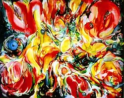 Inspired by publications on nebulae and black holes, Golahny began the Space series in 1980. In dozens of paintings she modeled her images on photographs of cosmic exploration in the archives of the Harvard College Observatory. She also painted evocative layerings of an imagined passage through space and time, and fantastic semi-formed creatures.[17] Art historian Alicia Faxon wrote of one of Golahny's paintings of the Crab Nebula, "Golahny's Crab Nebula . . . capture[s] the process of creation, a process that takes place both in the creation of the nebula and in the gestation of the painting itself. . . . In comparing Crab Nebula to the photographs that inspired the work, it is fascinating to see how much more vivid and complex the artist's interpretation is. The photographs appear static; the painting pulses with energy, embodying an endless universe in creation."[18]