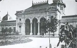 The foundation stone of the casino was laid on August 3, 1891,[8] followed by a ceremony featuring speeches from various notable figures, including Achille Vialatte. This event was similar in grandeur to the opening of the Grand Hotel.[14] The Besançon-les-Bains casino was inaugurated on July 10, 1892, with a grand evening event that included a concert, ballet, and fireworks over the Doubs River.[16][17] The building is situated within the gardens, exhibiting asymmetrical façades crafted from dressed stone. These façades are embellished with a plethora of decorative elements, including brightly colored ceramics, bronze ornaments, and sculptures.[18] To the left of the casino were the gaming rooms and the "cercle", in the center of the restaurant, and to the right the festivity hall, all connected at the front by an imposing marquee.[18] The "cercle" pavilion offered many gaming options, predominantly in the Greek Campana style. Additionally, it provided a reading room, a large salon adorned by sculptor Injalbert and painter Allard, a small salon in the Louis XVI style draped in silks, and a Japanese-style salon.[18]