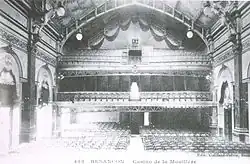 The casino also included a festivity hall, situated on the right side of the building. This hall was of considerable size and constructed from stone and iron. Its architectural design was the result of careful study and meticulous finishing. The hall was accessible through a grand vestibule with two stone staircases.[19] The hall was surmounted by a statue of dance, created by Just Becquet, and was designed with a specific purpose in mind: to accommodate theatrical performances, operas, symphonic concerts, or balls.[19] Additionally, the building encompassed a vast foyer, three levels of seating, and a superlative stage curtain bearing the signature of the Desservy company.[19] The roof was ingeniously designed, allowing a portion of the ceiling to be retracted and opened to the starry sky when weather conditions permitted; however, this system was compromised during a storm on July 1, 1895.[19]